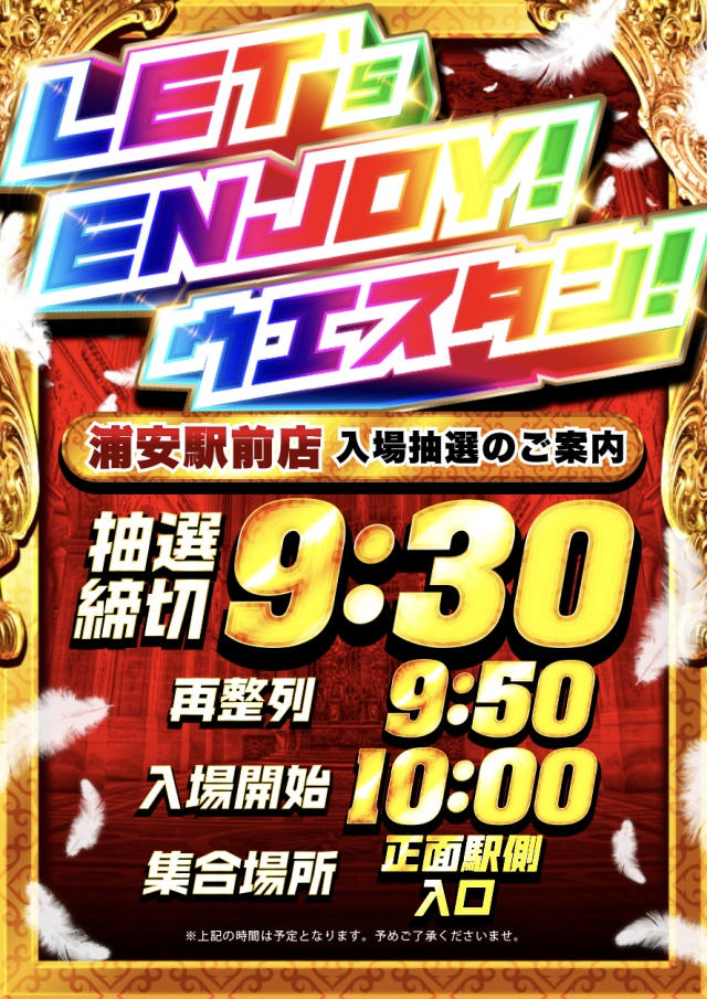 9:30迄に駅側入口へお並び頂いた方へ、入場整理券の抽選を行っております。※時間変動がある日は店内、HP、SNSにてお知らせいたします。 |