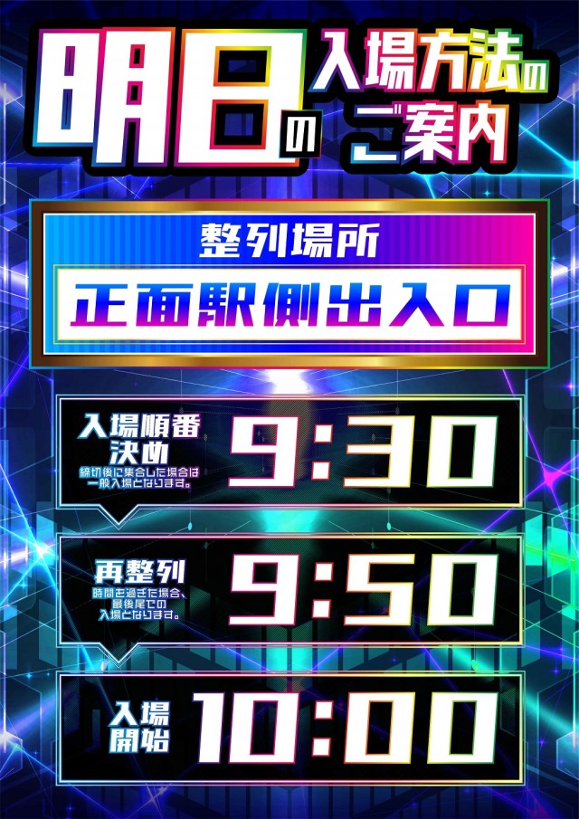 9:30迄に駅側入口へお並び頂いた方へ、入場整理券の抽選を行っております。※時間変動がある日は店内、HP、SNSにてお知らせいたします。 |