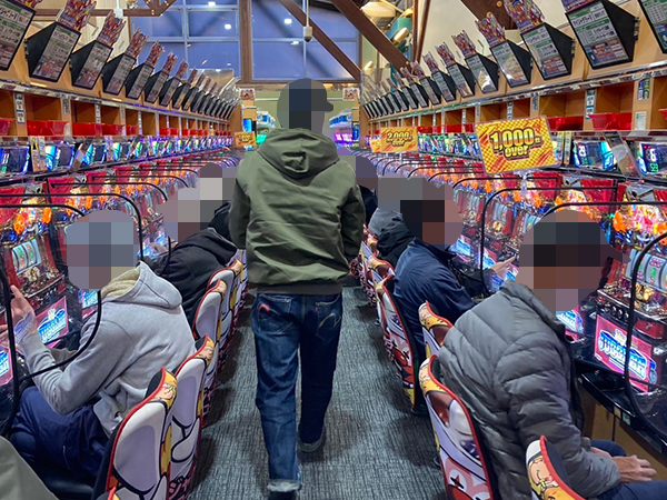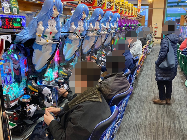 機種構成が魅力的な500円/90枚パチスロを見ると、ほぼ満席となるほどの支持を得ていた。