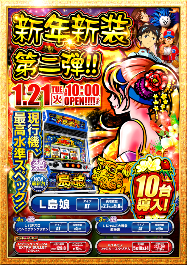 あす新装開店 スマスロ増台 島娘10台他最新台導入