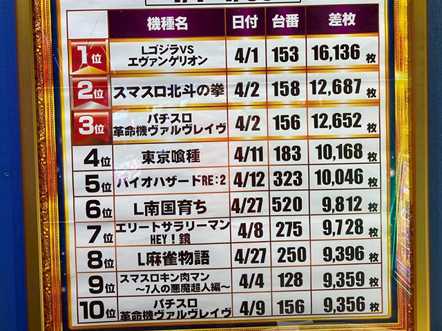 以上が5月3日に実施された「英雄のリアル」の結果である。2万枚にも届きそうな超優秀台が誕生し、+8,000枚超えも2台出現。くわえてATタイプだけではなく、沖スロやノーマルタイプも多数ランクインと、なんともにぎやかなランキングとなった。同店ならば自分好みのタイプの機種で大成果をあげられる。そう確信させてくれた有意義な1日であった。