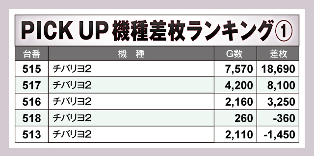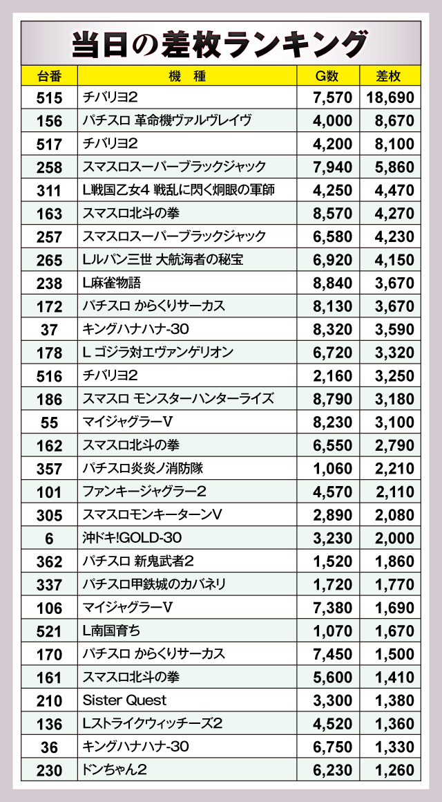 トップを飾ったのは『チバリヨ2』。515番台が+18,690枚と、2位に1万枚の差をつける圧倒的な結果を残している。『チバリヨ2』は他にも517番台が+8,100枚、516番台が+3,250枚と、TOP30に3台ランクインする大活躍だった。