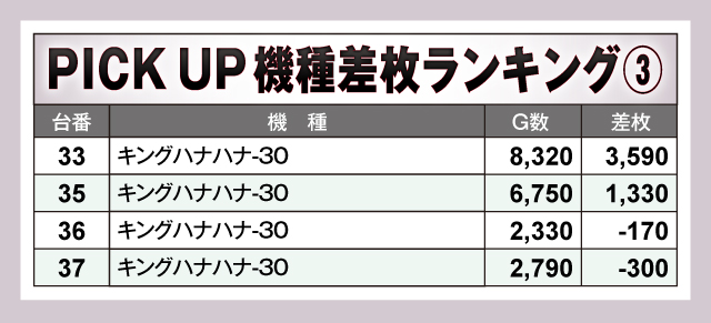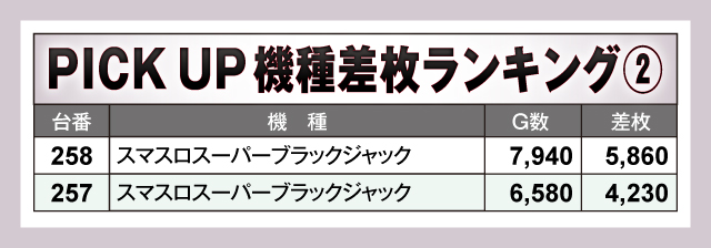 注目4機種をピックアップして見てみよう。超優秀台が3台あらわれた『チバリヨ2』は当然のことながら、『キングハナハナ-30』を見ると、しっかりとG数を稼いだ台が結果を残していることがうかがえる。とくに『スマスロスーパーブラックジャック』は設置2台いずれもが大幅プラス差枚と、打っていたプレイヤーの期待に応える結果となった。
