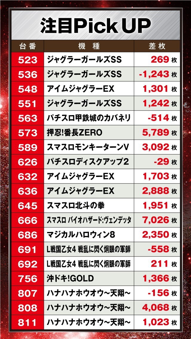 また、Aタイプ以外にも好調台が多く、『スマスロ バイオハザード:ヴェンデッタ』で+7,026枚、『押忍!番長ZERO』で5,789枚、『スマスロモンキーターンV』で+3,092枚を記録している。