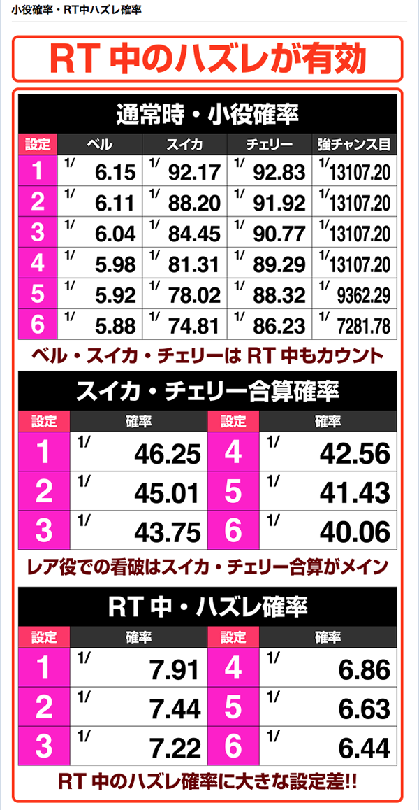 通常時のスイカ・チェリー確率やRT中のハズレ確率に設定差が存在。サンプルを増やして設定推測に活かそう。