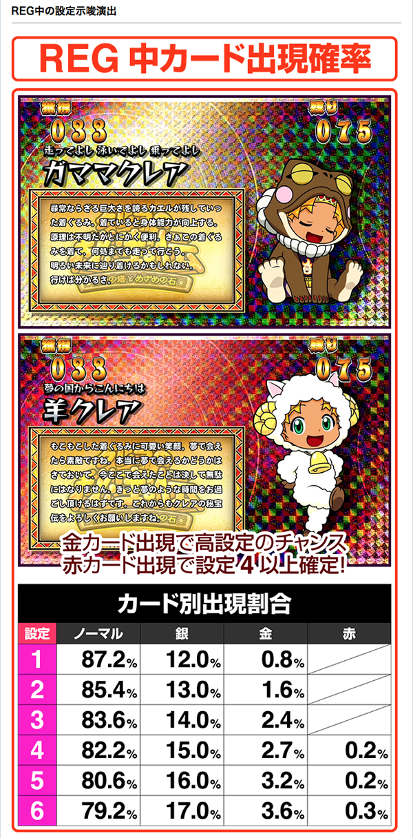 また、REG中に赤カード出現で設定4以上が濃厚。ビタ押し成功時は大人クレアのボイスが発生すれば、設定5or6が濃厚となる。