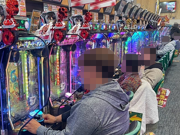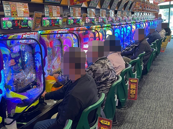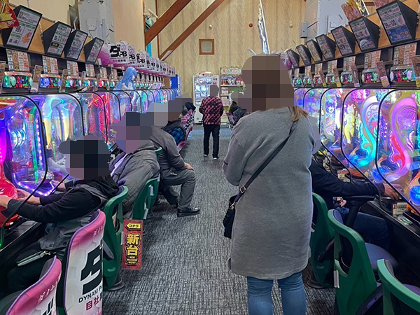 取材時は多くのプレイヤーが来店。パチンコ・パチスロともに、様々な機種が支持を得ていた。