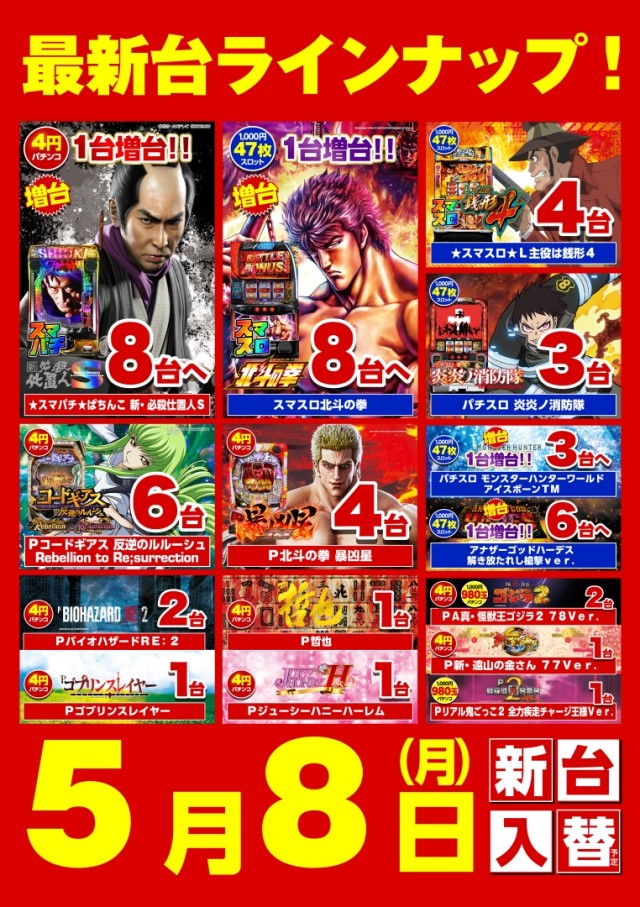 4パチ223台/ 1パチ128台/0.4パチ32台/ 1000円46枚スロ190台/5スロ30台/2.5スロ22台