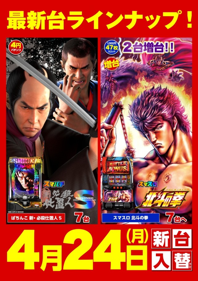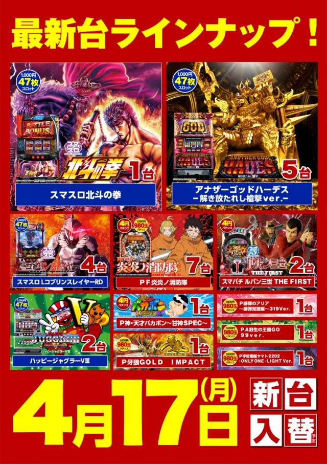 4パチ223台/ 1パチ128台/0.4パチ32台/ 1000円46枚スロ190台/5スロ30台/2.5スロ22台