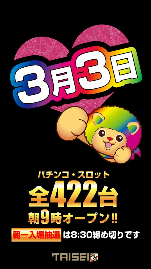 明日3月3日(火)🌈全機9時開店🌈抽選は8時半~です❗