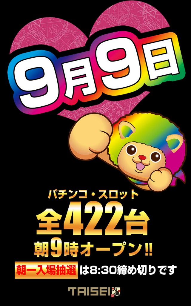 明日9月9日(火)🌈全機9時開店🌈抽選は8時半~です❗