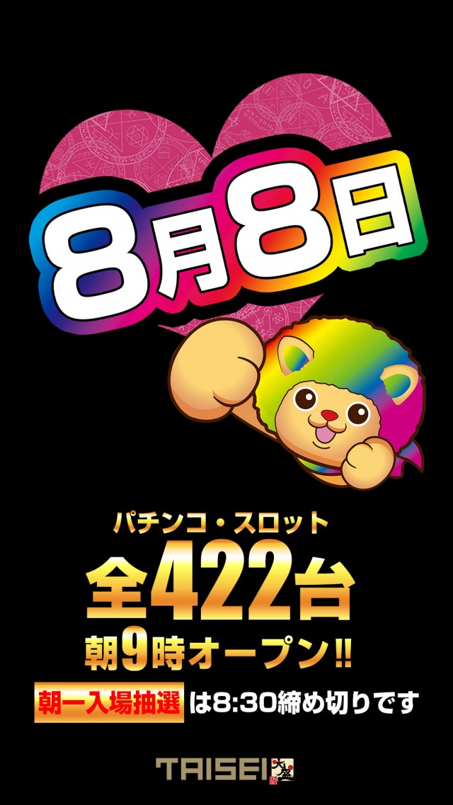 あす8月8日(金)🌈全機9時開店🌈抽選は8時半~です❗