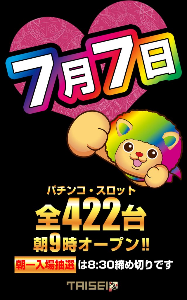 明日7月7日(月)🌈全機9時開店🌈抽選は8時半~です❗