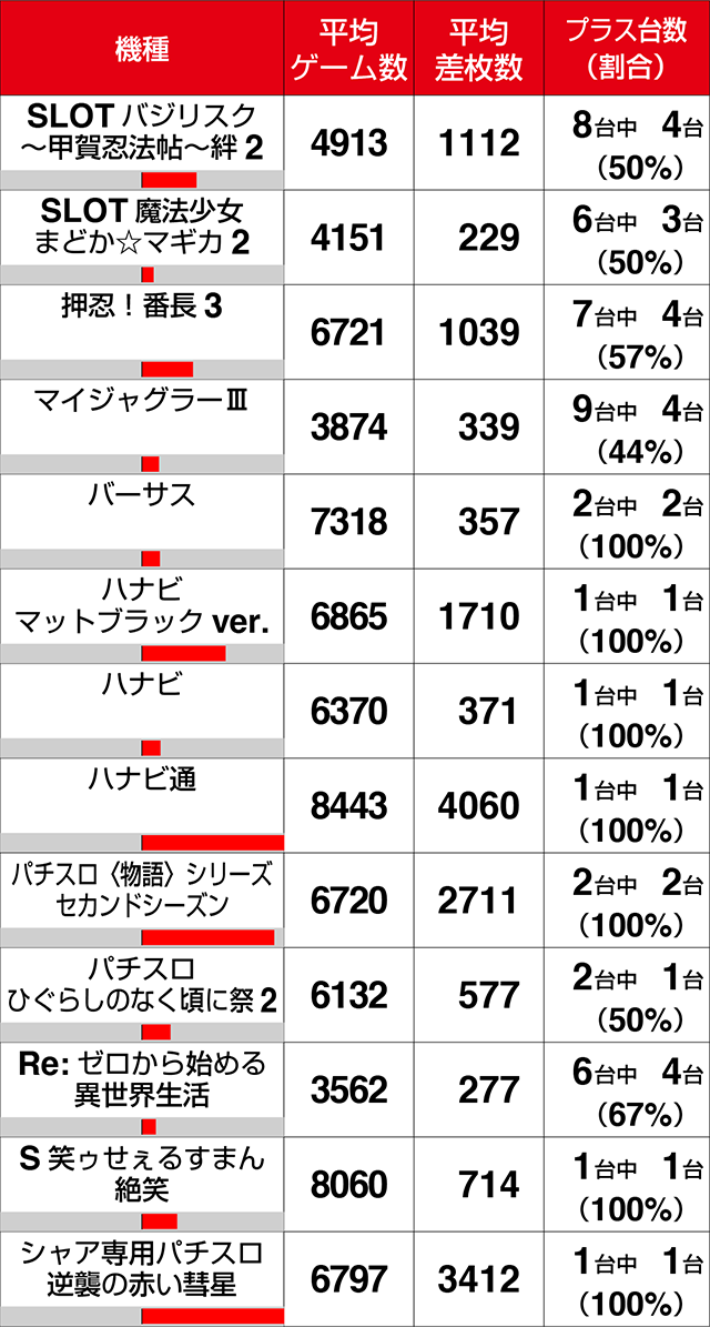 8台設置の『SLOTバジリスク~甲賀忍法帖~絆2』と7台設置の『押忍!番長3』は平均差枚数が1000ptオーバー。