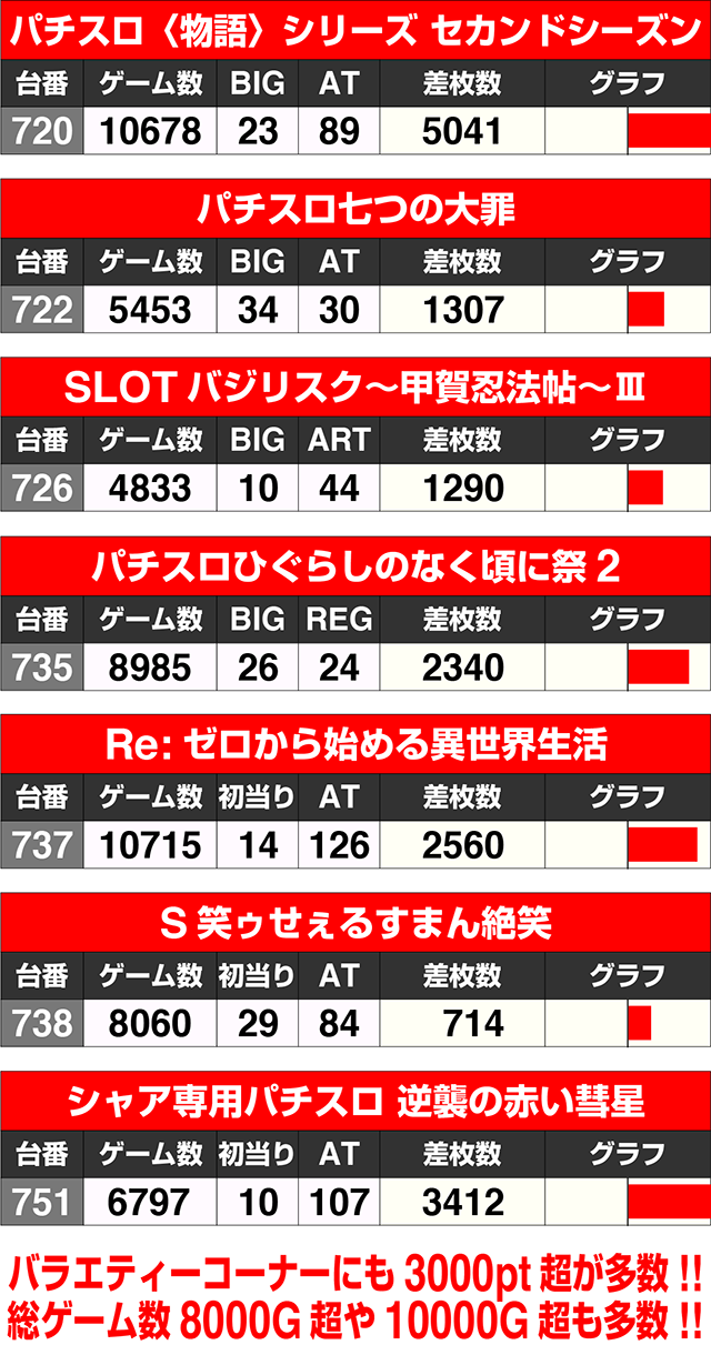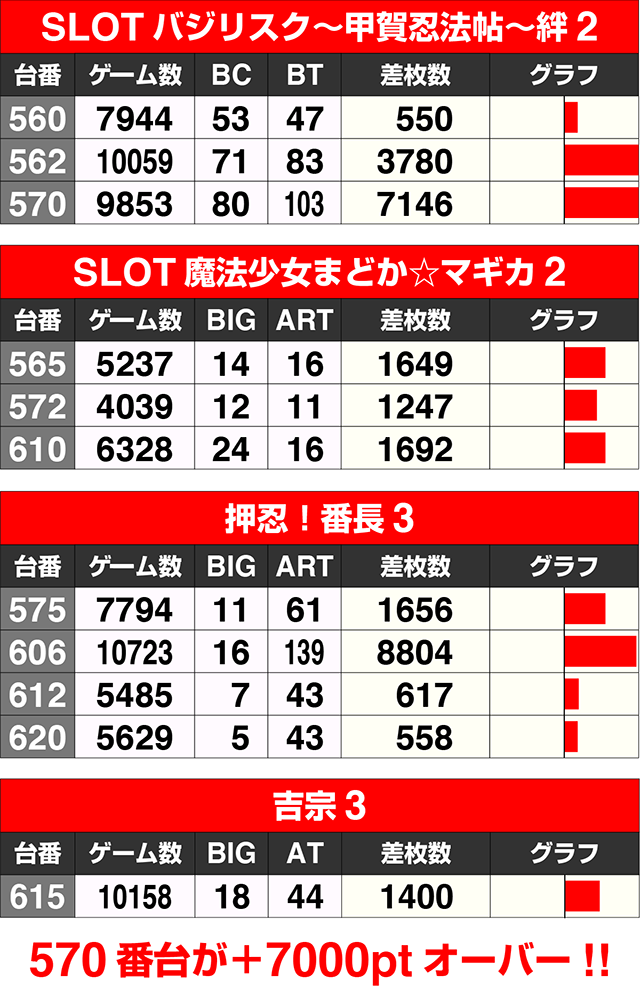 この日のトップは、606番台の『押忍!番長3』が記録した+8804pt。『SLOTバジリスク~甲賀忍法帖~絆2』の570番台も7000ptを超えた。