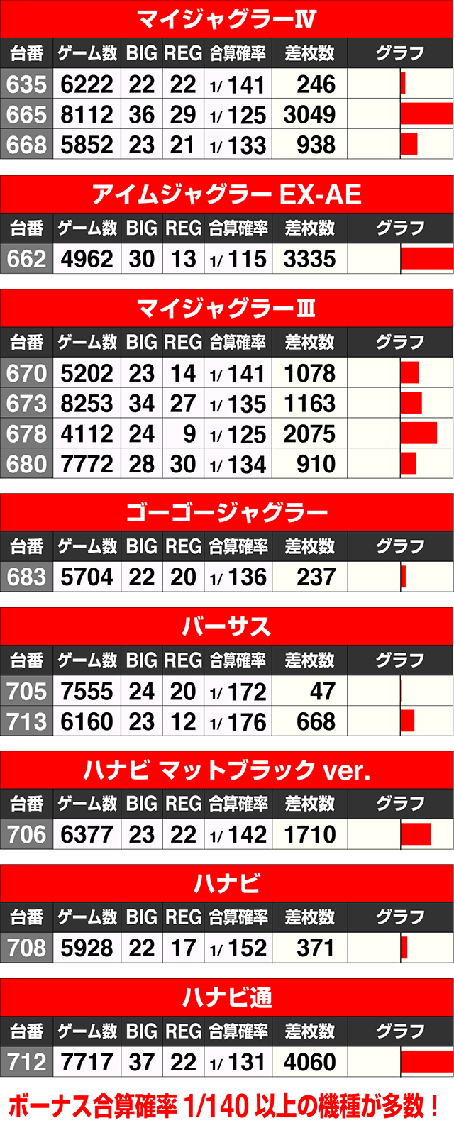 ジャグラーシリーズでは、『マイジャグラーⅣ』の665番台と『アイムジャグラーEX-AE』の662番台のボーナス合算確率が1/130以上。