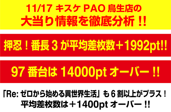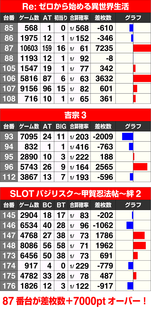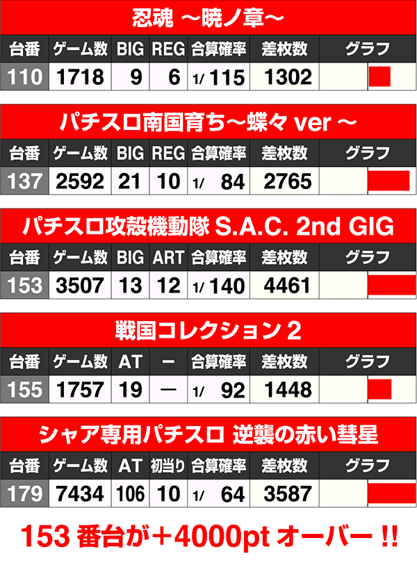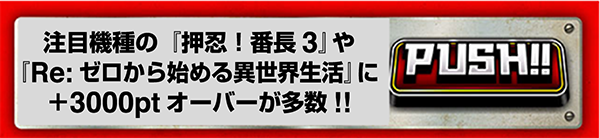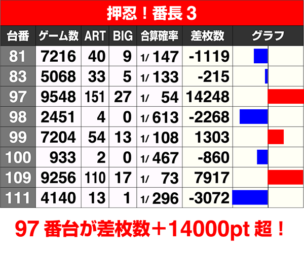 『押忍!番長3』の97番台が+14248ptを記録。109番台もART回数100回超、差枚数+7000ptオーバーと、好調台が目立った。
