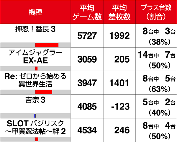 『アイムジャグラーEX-AE』や『SLOTバジリスク~甲賀忍法帖~絆2』も半数の台がプラスを記録した。