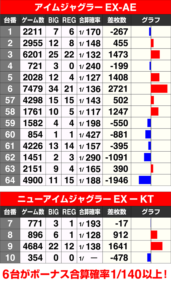 『アイムジャグラーEX-AE』は14台中7台がプラス。『ニューアイムジャグラーEXーKT』も4台中2台がボーナス合算確率が1/140以上であった。