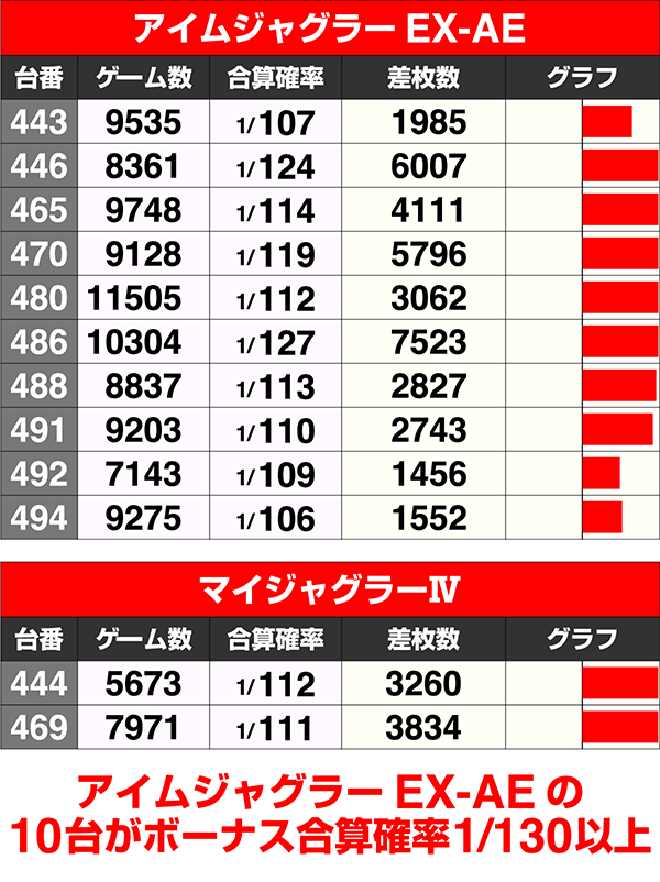 『アイムジャグラーEX-AE』は26台中18台がプラス。10台の差枚数が+1000ptを上回ったなかで、5台は+3000ptオーバーを記録した。