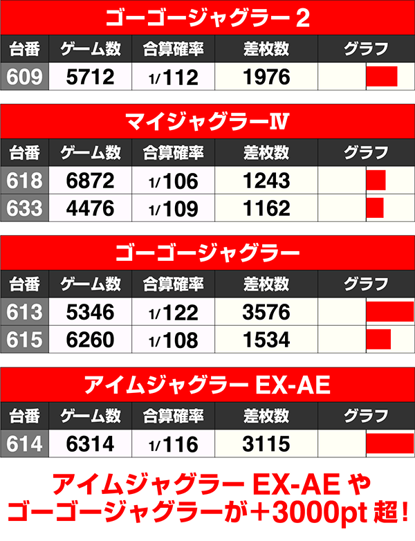 『ゴーゴージャグラー』は2台がボーナス合算確率1/130以上で、613番台は差枚数が3500ptを上回った。