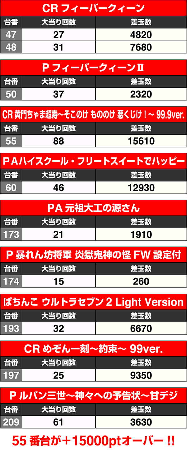 55番台の『CR黄門ちゃま超寿〜そこのけ もののけ 悪くじけ!〜 99.9ver.』の差玉は15000ptを超えた。