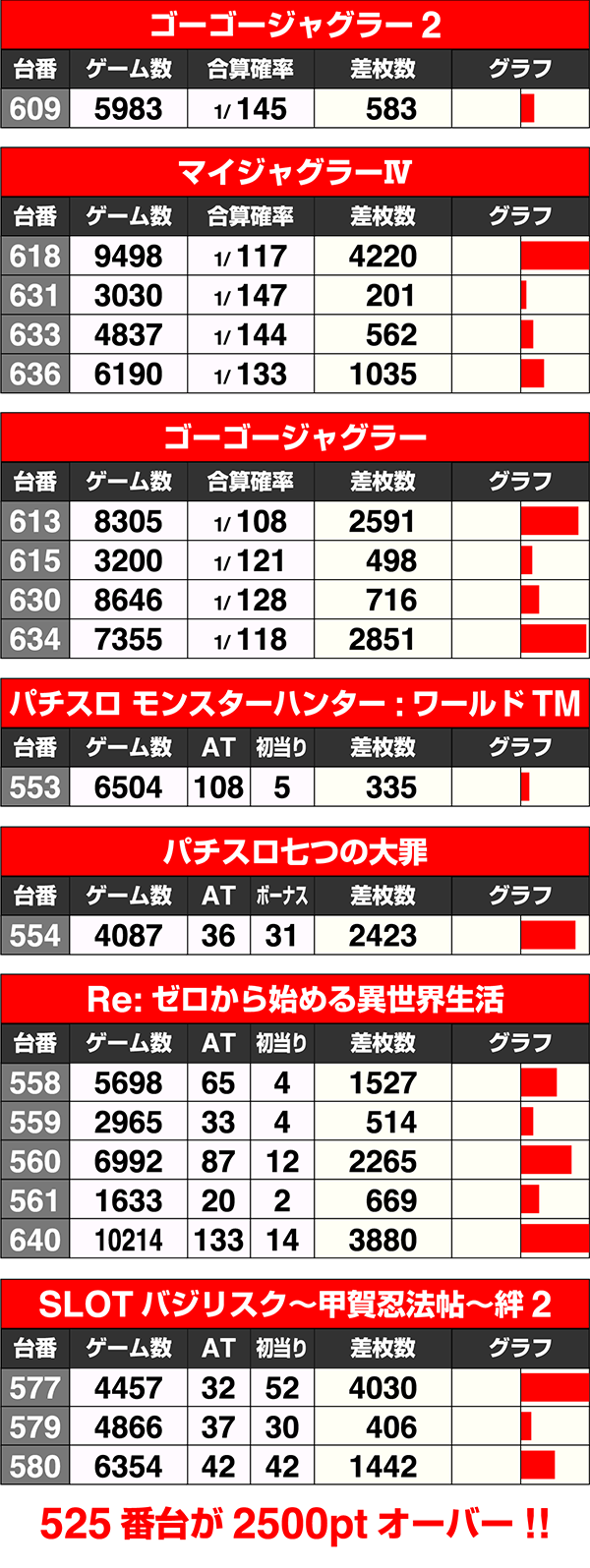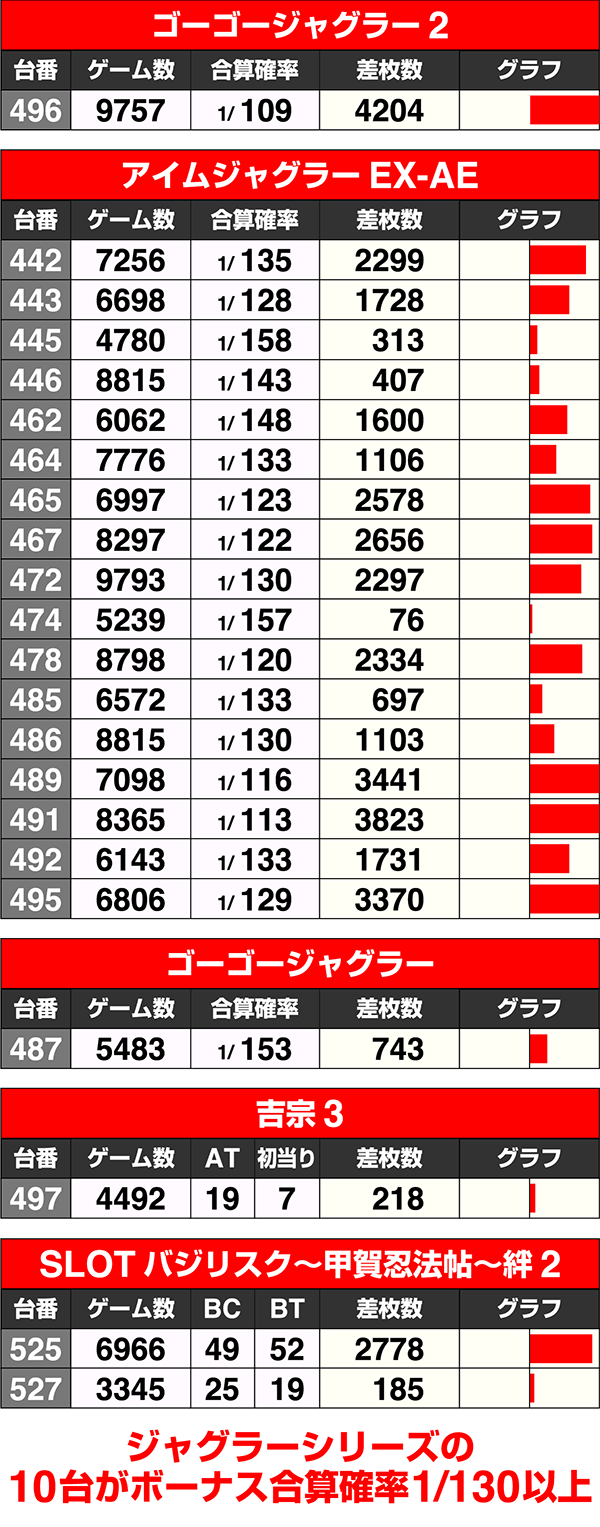 496番台の『ゴーゴージャグラー2』はボーナス合算確率は1/110超。525番台の『SLOTバジリスク~甲賀忍法帖~絆2』は差枚数が+2500ptを上回った。