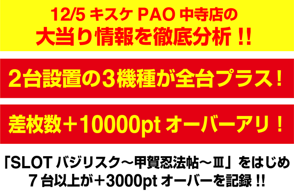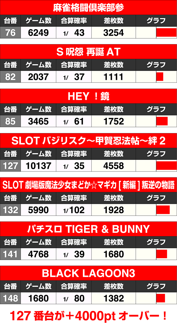 127番台の『SLOTバジリスク~甲賀忍法帖~絆2』はゲーム数10000G以上、差枚数+4500ptオーバーと好記録。