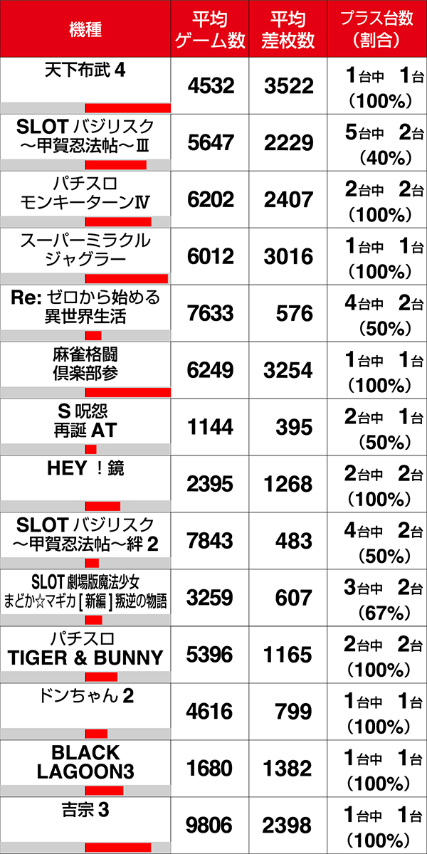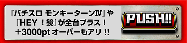 『パチスロ モンキーターンⅣ』と『HEY!鏡』、『パチスロ TIGER & BUNNY』が全台プラス。