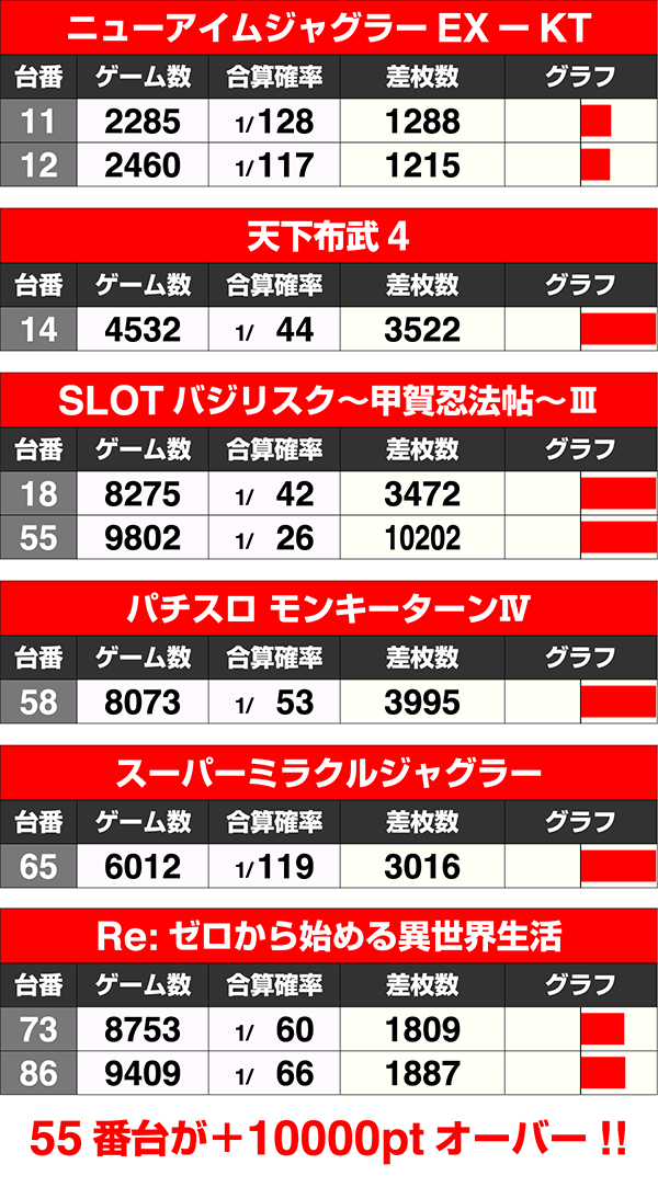 『SLOTバジリスク〜甲賀忍法帖〜Ⅲ』の2台が+3000ptを上回り、55番台は+10202ptを記録した。