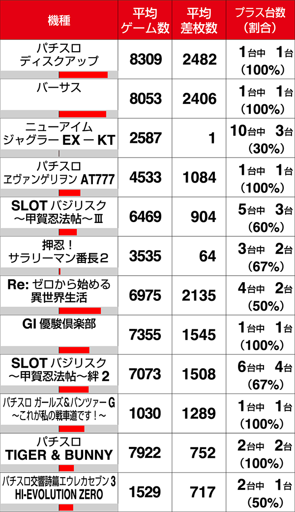 『パチスロディスクアップ』と『バーサス』はともにゲーム数8000G以上と支持を集め、差枚数は+2400pt超。