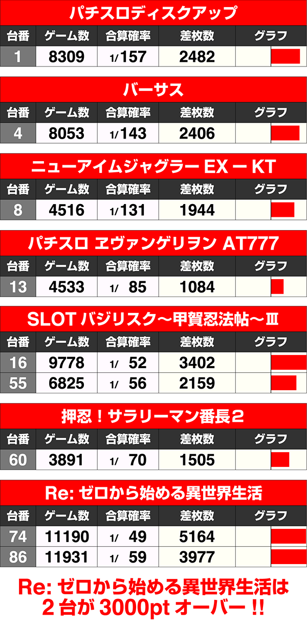 『Re:ゼロから始める異世界生活』と『SLOTバジリスク~甲賀忍法帖~絆2』は、平均差枚数+1500pt超。
