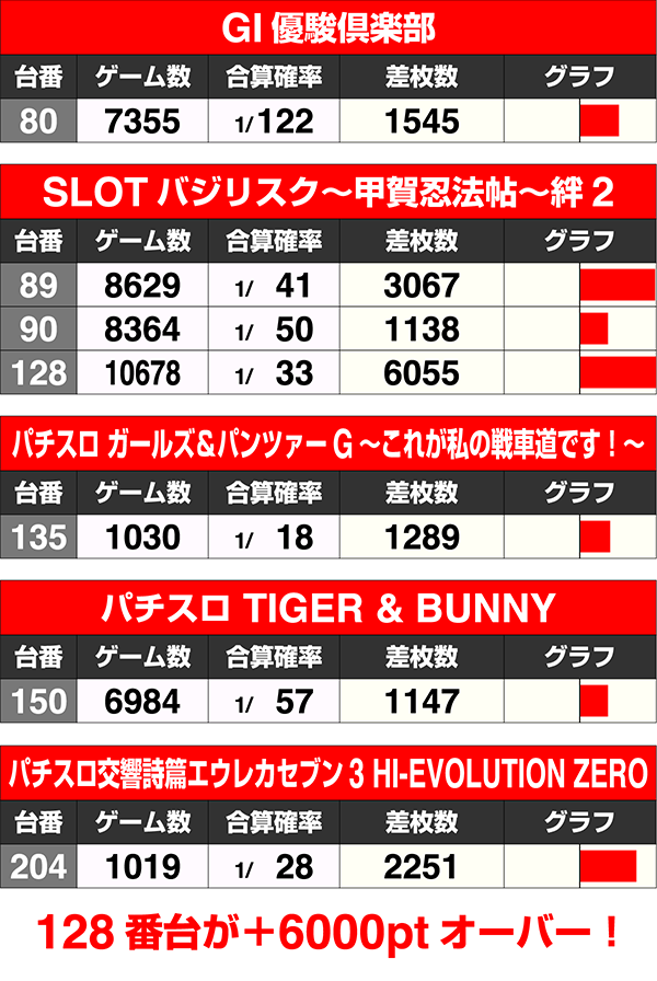 10000G以上楽しまれた『SLOTバジリスク~甲賀忍法帖~絆2』の128番台は、差枚数+6055ptを記録した。