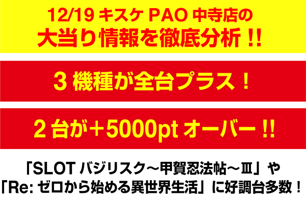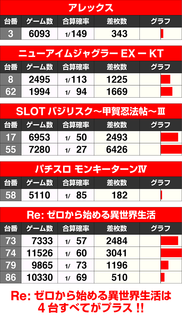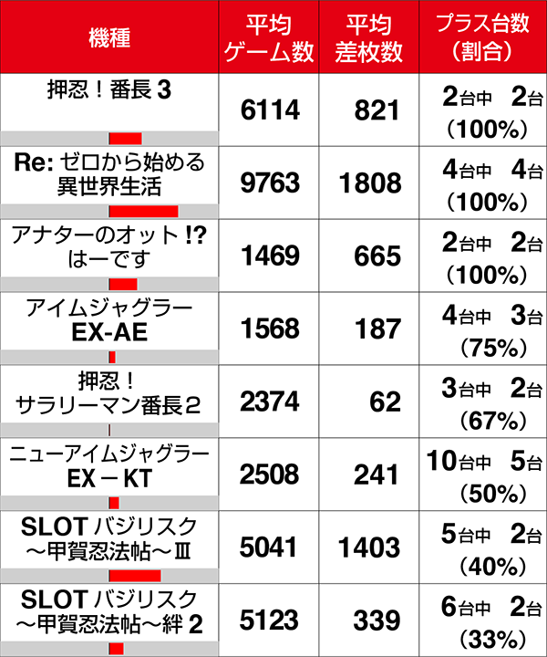『SLOTバジリスク〜甲賀忍法帖〜Ⅲ』と『SLOTバジリスク~甲賀忍法帖~絆2』はプラスを記録した2台がともに+2000ptを上回った。