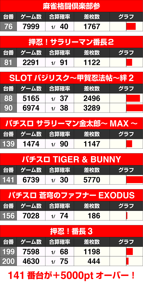 141番台の『パチスロ TIGER & BUNNY』は+5000ptを超える好記録を残した。