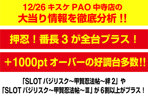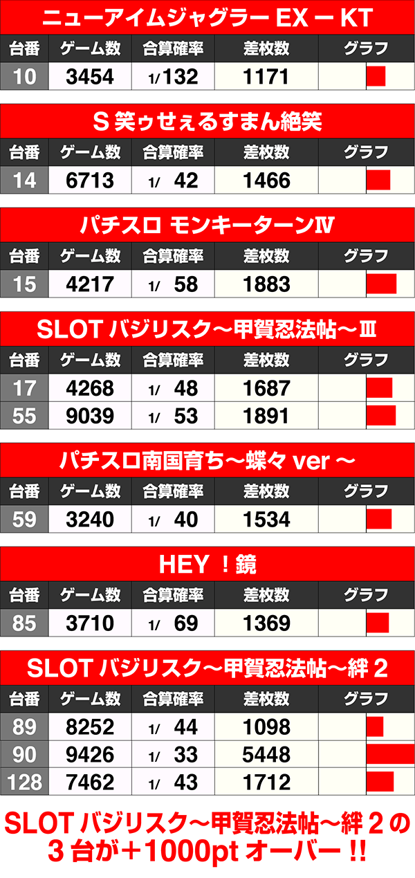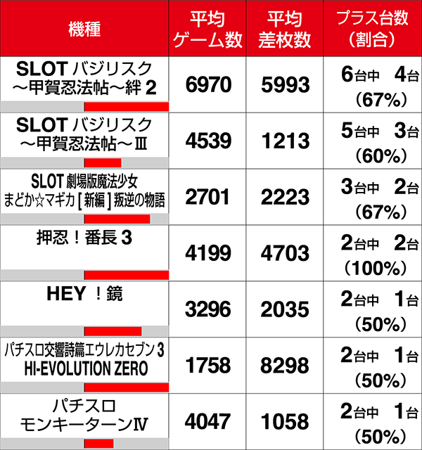 『SLOTバジリスク~甲賀忍法帖~絆2』は6台中4台がプラス、『SLOTバジリスク〜甲賀忍法帖〜Ⅲ』は5台中3台がプラスと、6割以上がプラスであった。