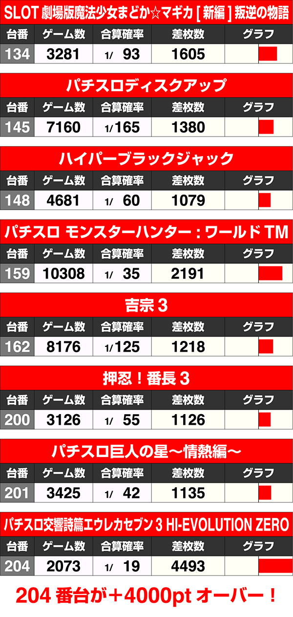 18台以上が+1000ptを上回ったなかで、『パチスロ交響詩篇エウレカセブン3 HI-EVOLUTION ZERO』の+4493ptがとくに目立った。