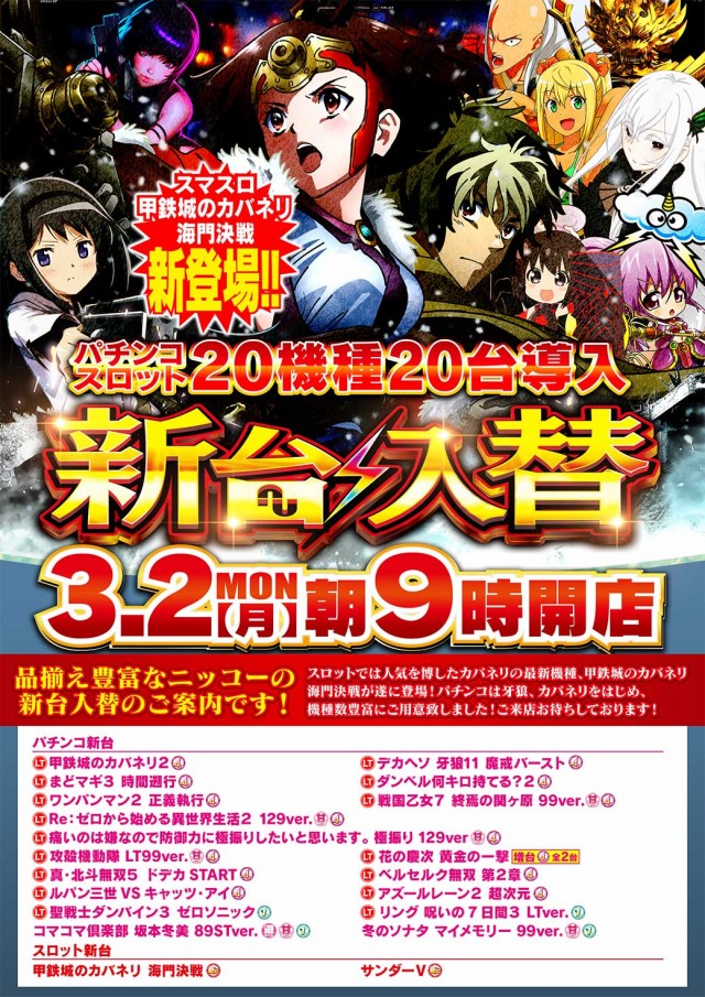 明日3月3日(火)新台入替2日目 全館朝9時オープン
