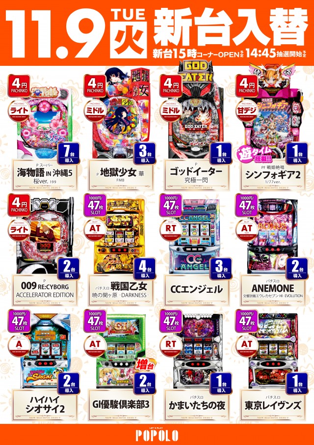 本日新台入替(予定)❗😊ご来店お待ちしております😌
