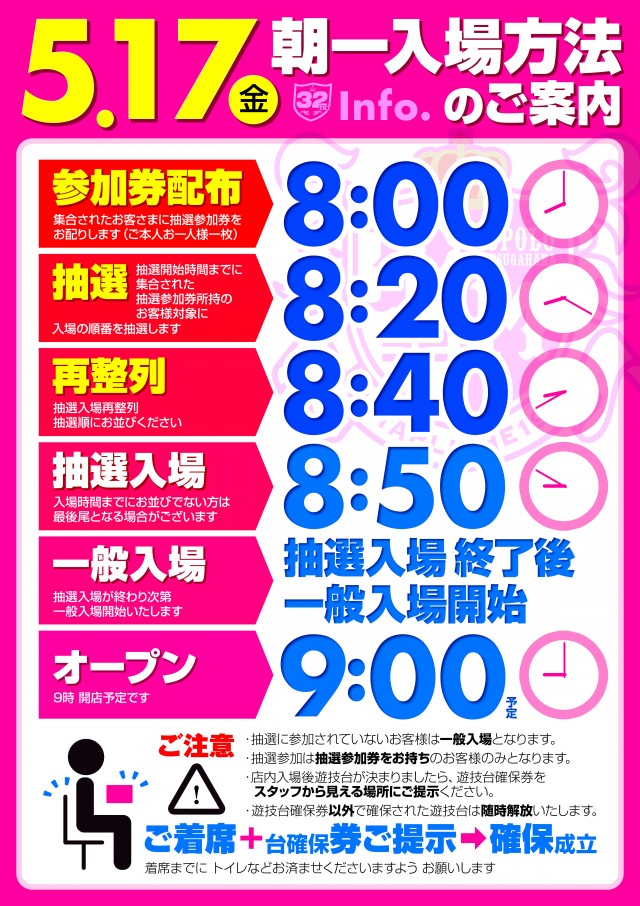 毎朝8:40にお並び頂いた方で入場順を抽選します。参加に会員カードは不要です。 |
