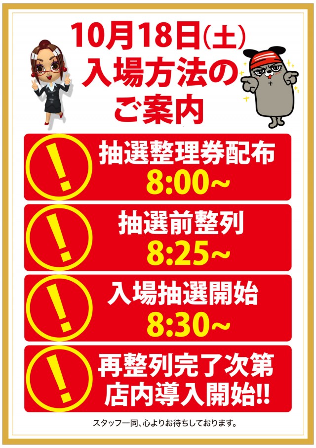 【8:00~】抽選順番券配布 【8:40~】正面入り口にて入場抽選開始 【8:50~】抽選番号順で入場 |
