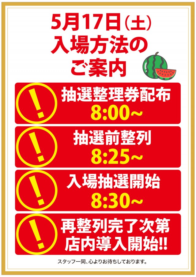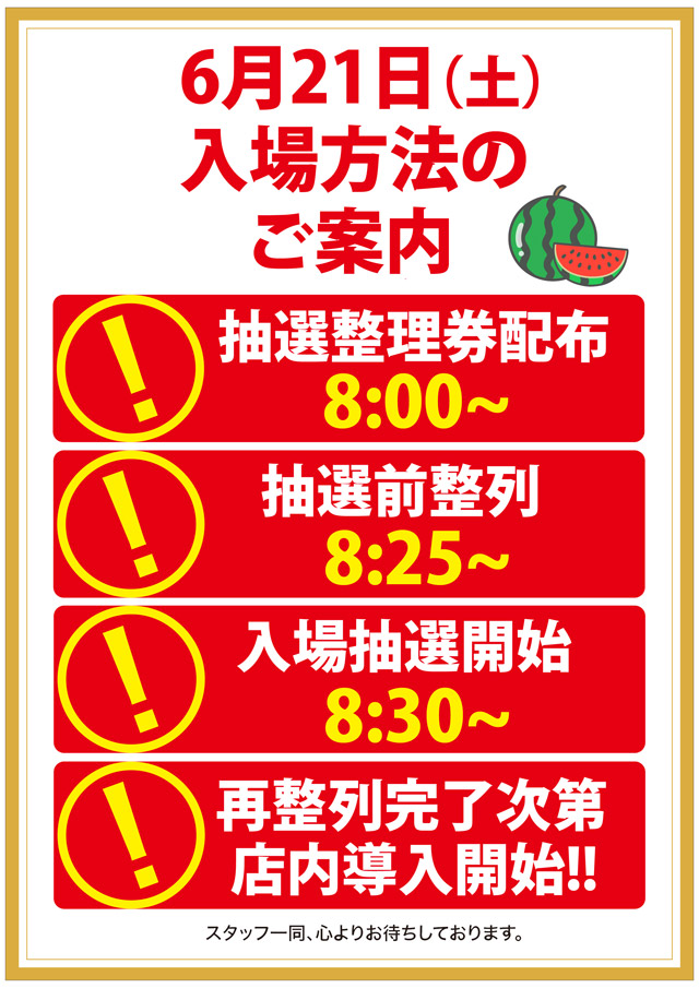 【8:00~】抽選順番券配布 【8:40~】正面入り口にて入場抽選開始 【8:50~】抽選番号順で入場 |
