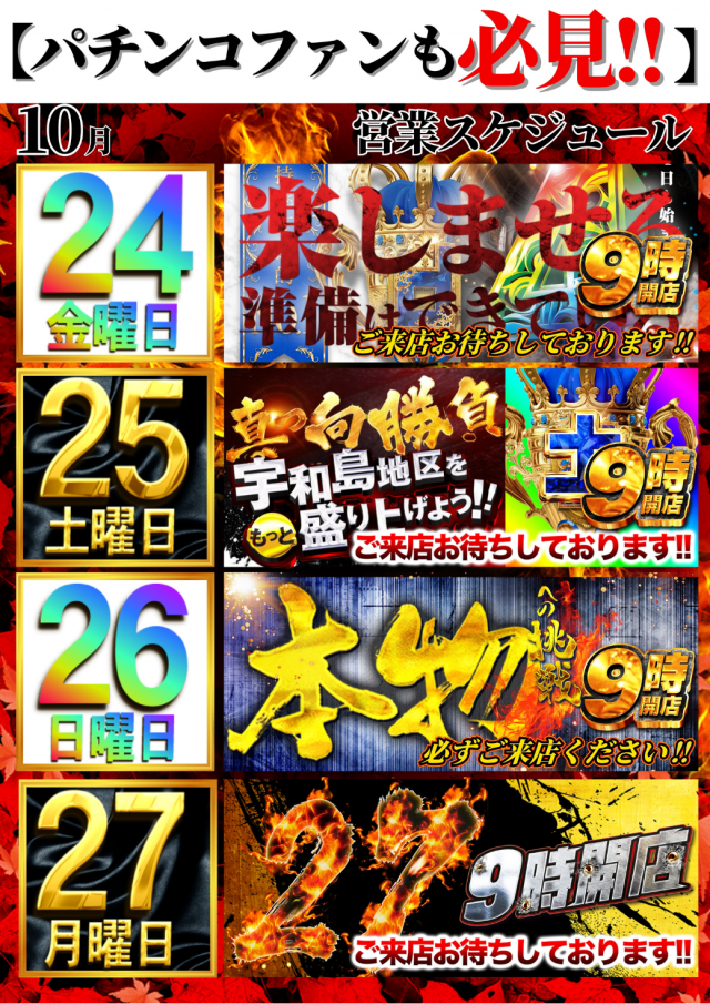 1位 10月25日(土) 2位 10月26日(日) 3位 10月24日(金)