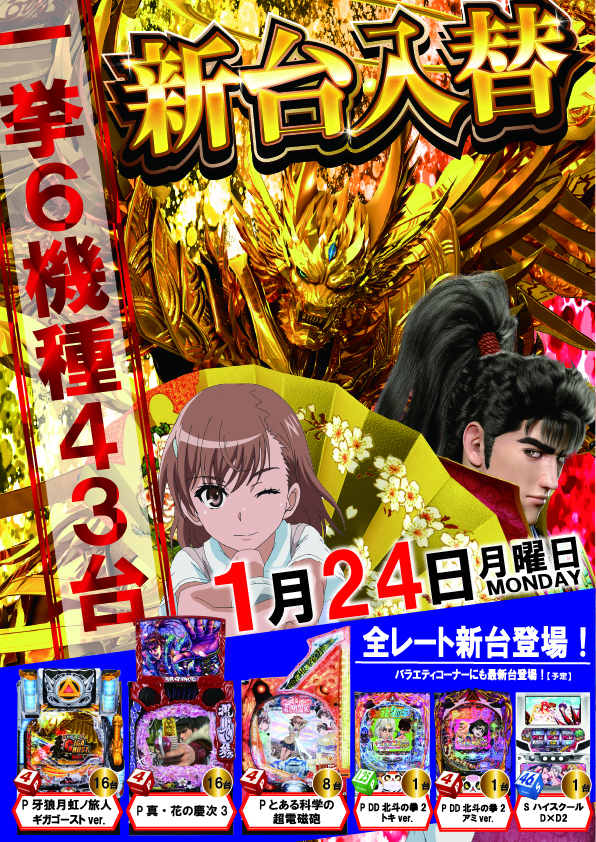 本日新台入替!全館9時開店。新台は15時開店予定です。