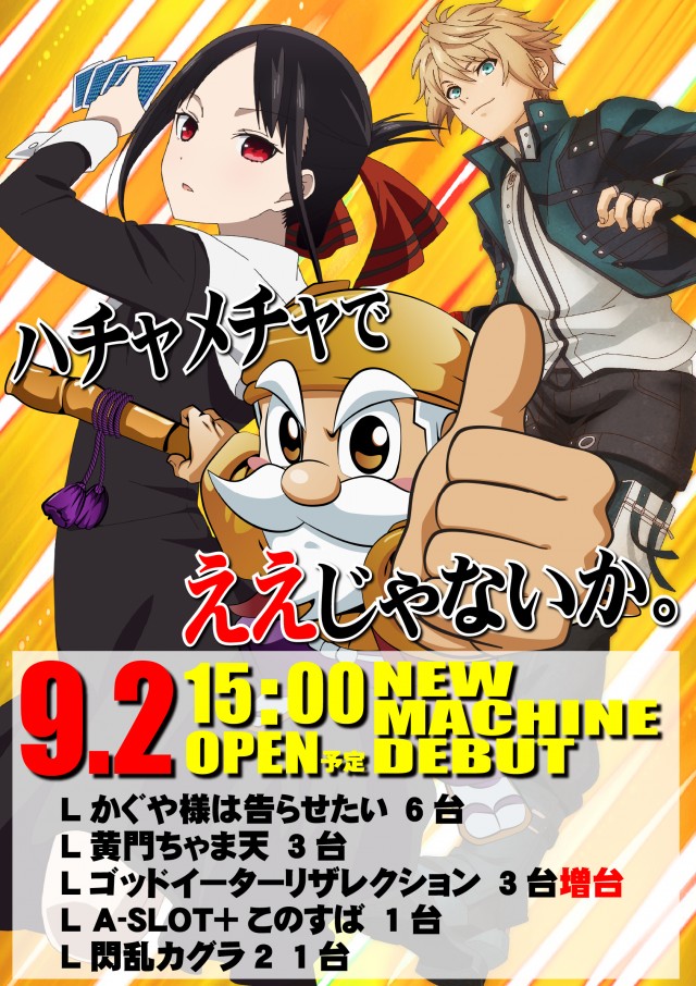 9月2日新台入替!この後13時~新台抽選参加券配布予定。