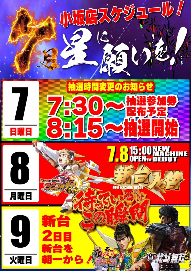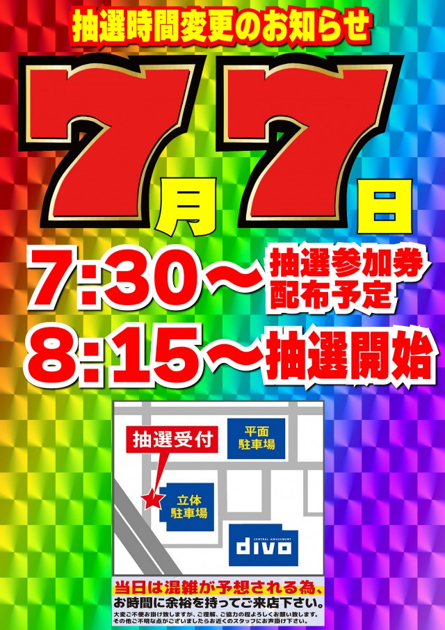 7月7日 本日抽選時間変更! ご来店をお待ちしております!