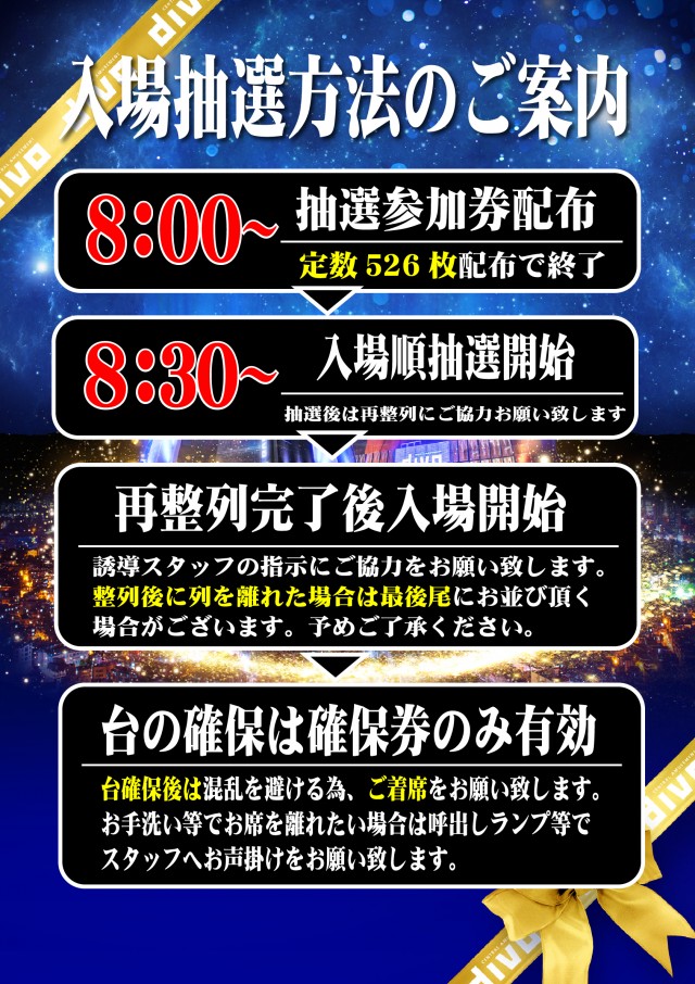 8:00~8:35入場抽選受付 8:40結果発表 8:45整列 |