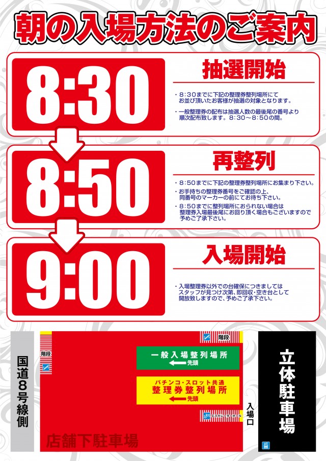 週末及び、混雑が予想される日は抽選となります。8:30抽選開始。 |