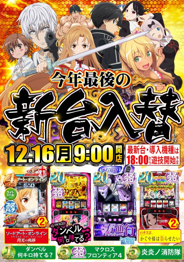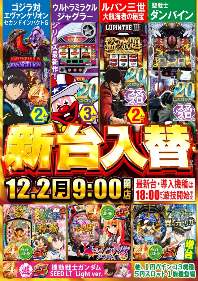 ☆本日☆新台入替(予定)☆9時スタート☆最新台は18時開放!