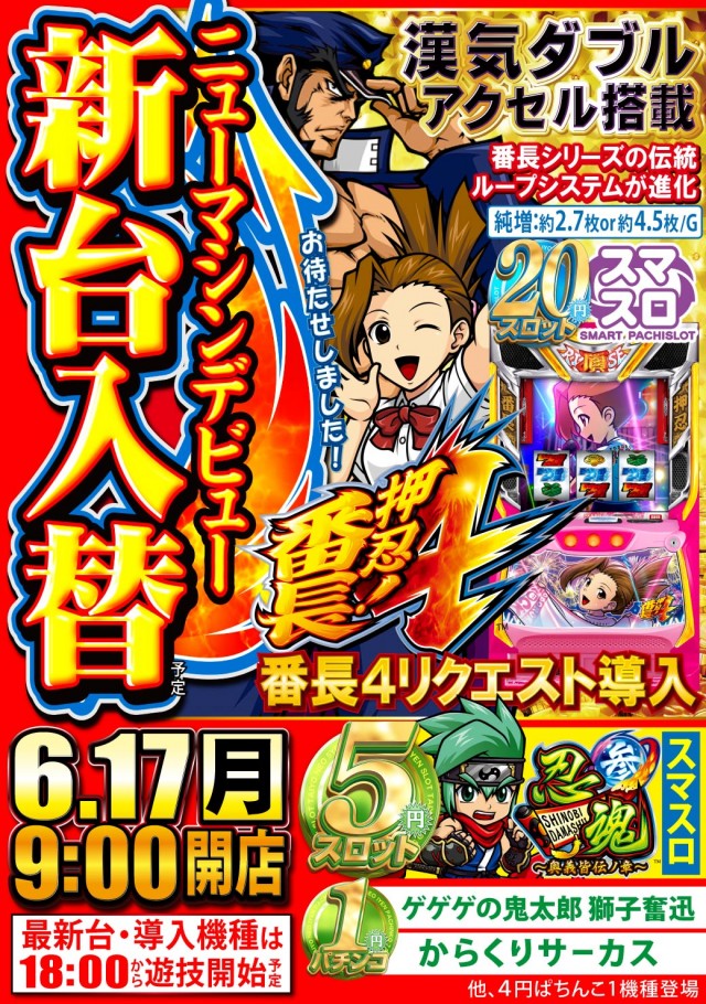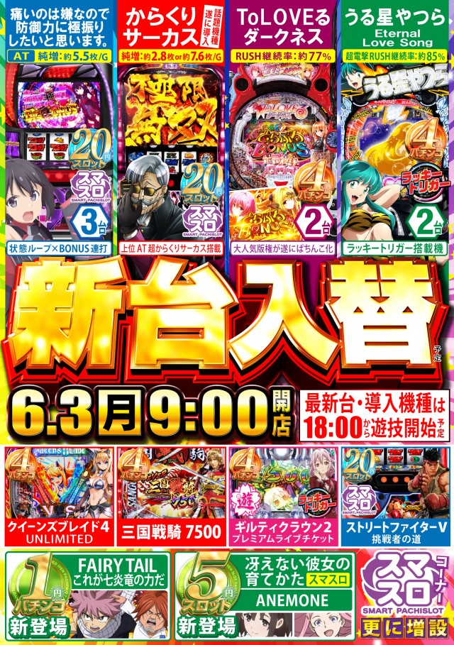 ☆本日☆新台入替(予定)☆9時スタート☆最新台は18時開放!